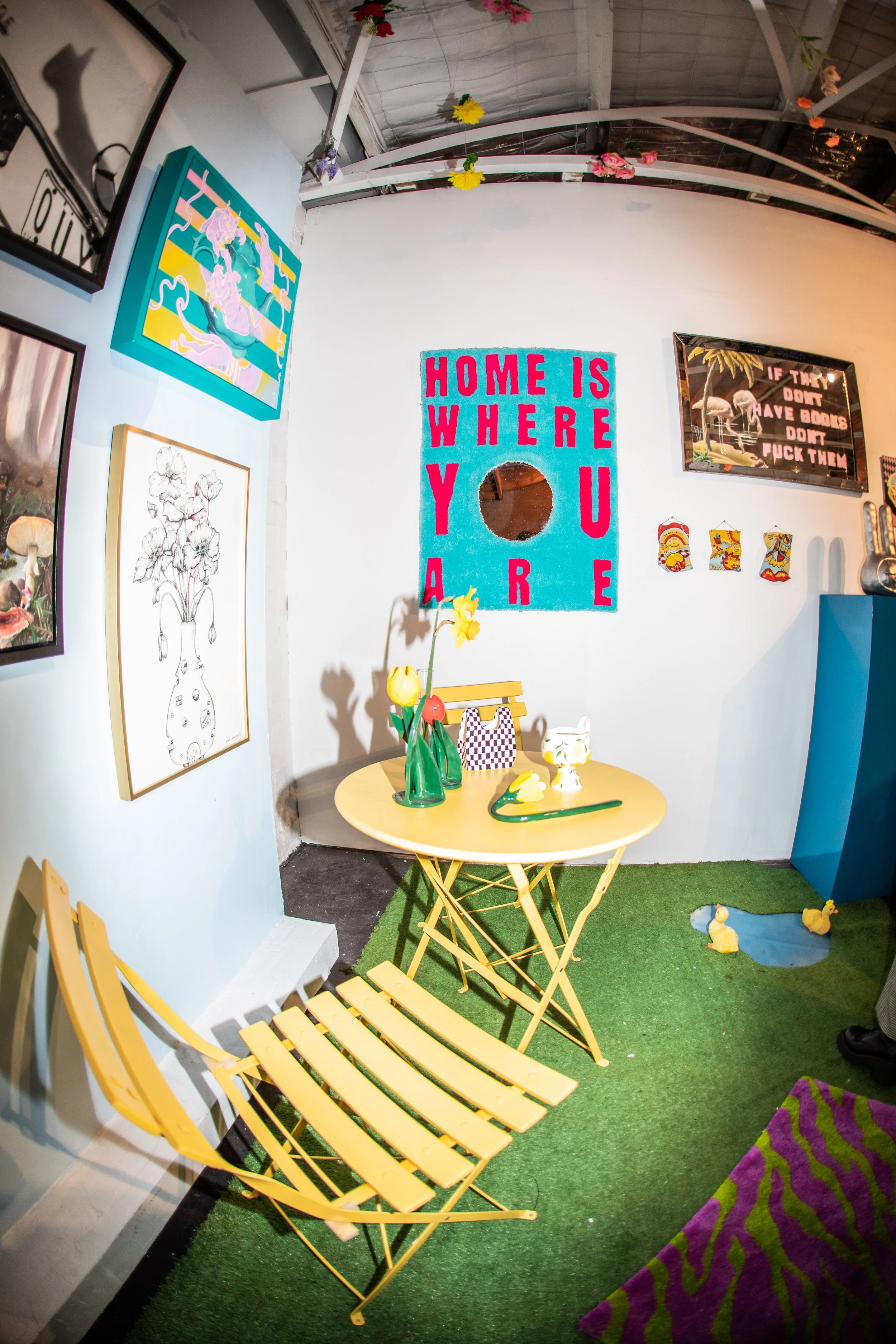 ‘WELCOME HOME’ IS A DARING REIMAGINATION OF A GALLERY SPACE. WITH SHANAHBELLES EXPERTISE IN PRODUCTION DESIGN AND SET DECORATION, THE PAIR COMBINED ART IN ALL FORMATS AND FORMS WITH SET DESIGN TO CREATE AN IMMERSIVE EXPERIENCE. INVITING YOU TO MAKE YOURSELF AT HOME AND FEEL THE LOVE AND EXCITEMENT BROUGHT TO YOU BY A COLLECTION OF MAXIMALIST, ECCENTRIC AND HOME-INSPIRED MIXED MEDIA WORKS CREATED BY 30+ AMAZING ARTISTS.